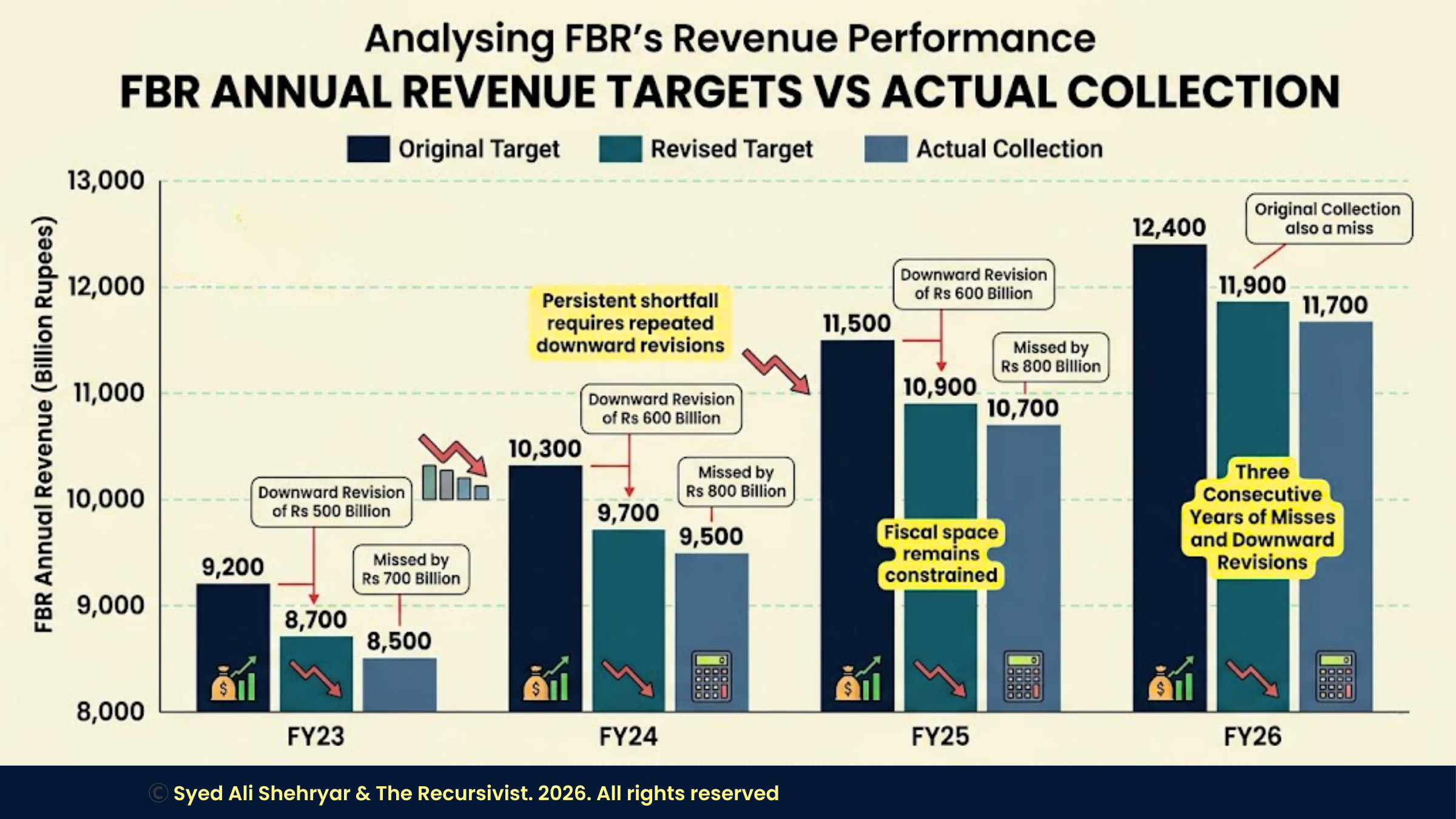 The FBR gap did not start with the Iran war. FBR missed its FY25 target by Rs178 billion after two downward revisions, and the Tajir Dost Scheme (a government programme to bring traders into the tax net) raised near-zero revenue against a Rs50 billion target.
