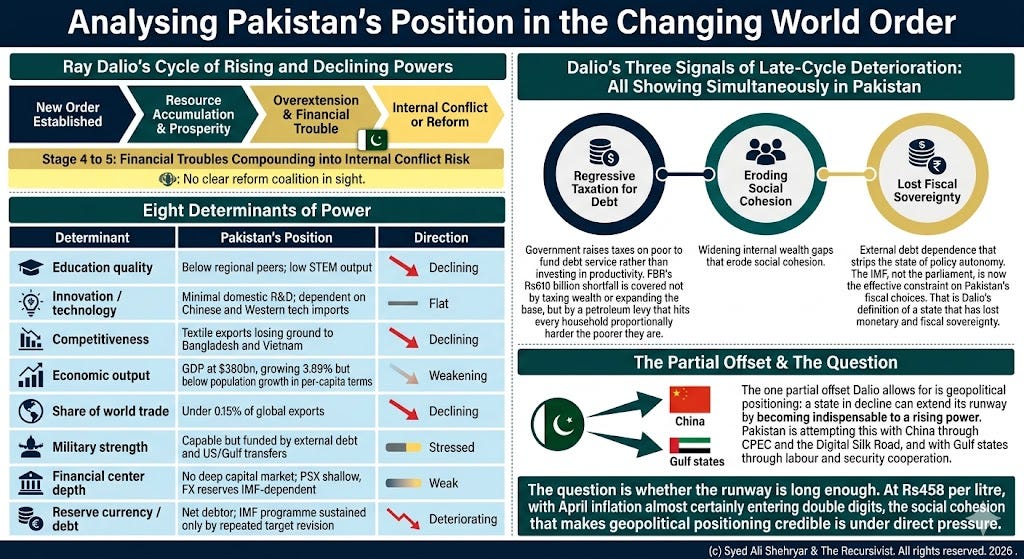 Each external shock therefore finds the same unfixed revenue base that IMF tries to fix. Not the cabinet. Not parliament. That is where Pakistan sits in the arc of a state in financial trouble: The decisions that matter most are made outside its own institutions.