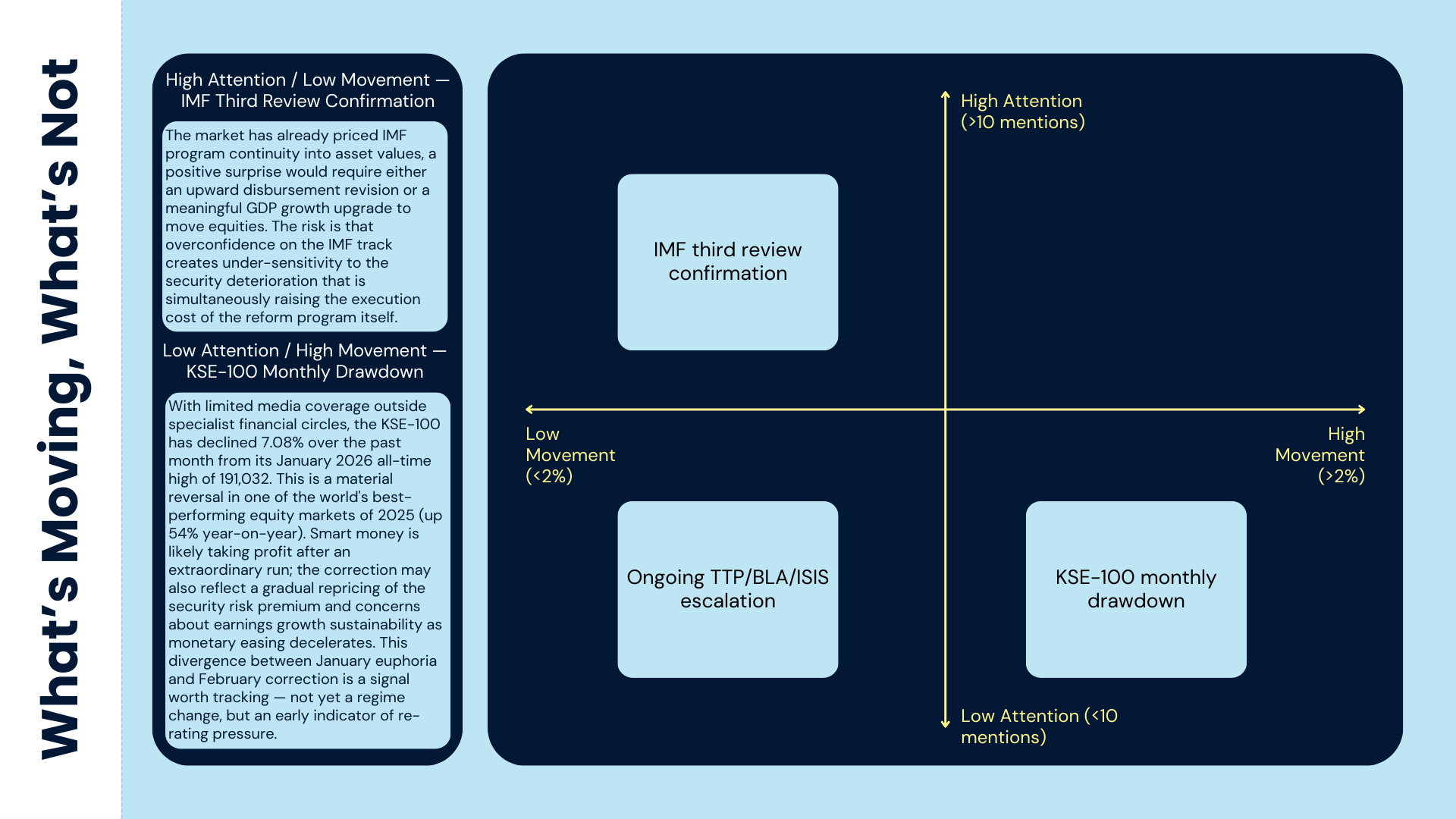 This week, our focus was on the structural divergence between Pakistan's IMF-tracked macro stabilization and its rapidly deteriorating security environment as the twin drivers of risk and opportunity for every stakeholder with Pakistan exposure.
