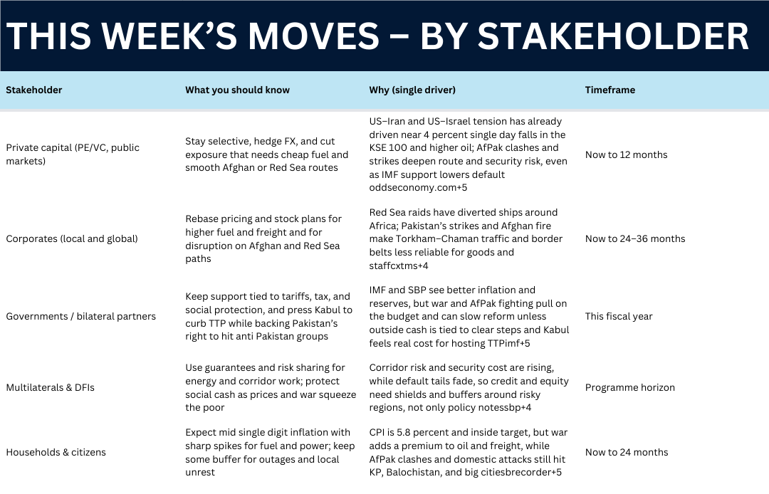 For households, the mix of war, oil, and domestic politics means mid single digit inflation with spikes on fuel, power, and some food, plus some risk of outages and unrest in KP, Balochistan, and big cities.