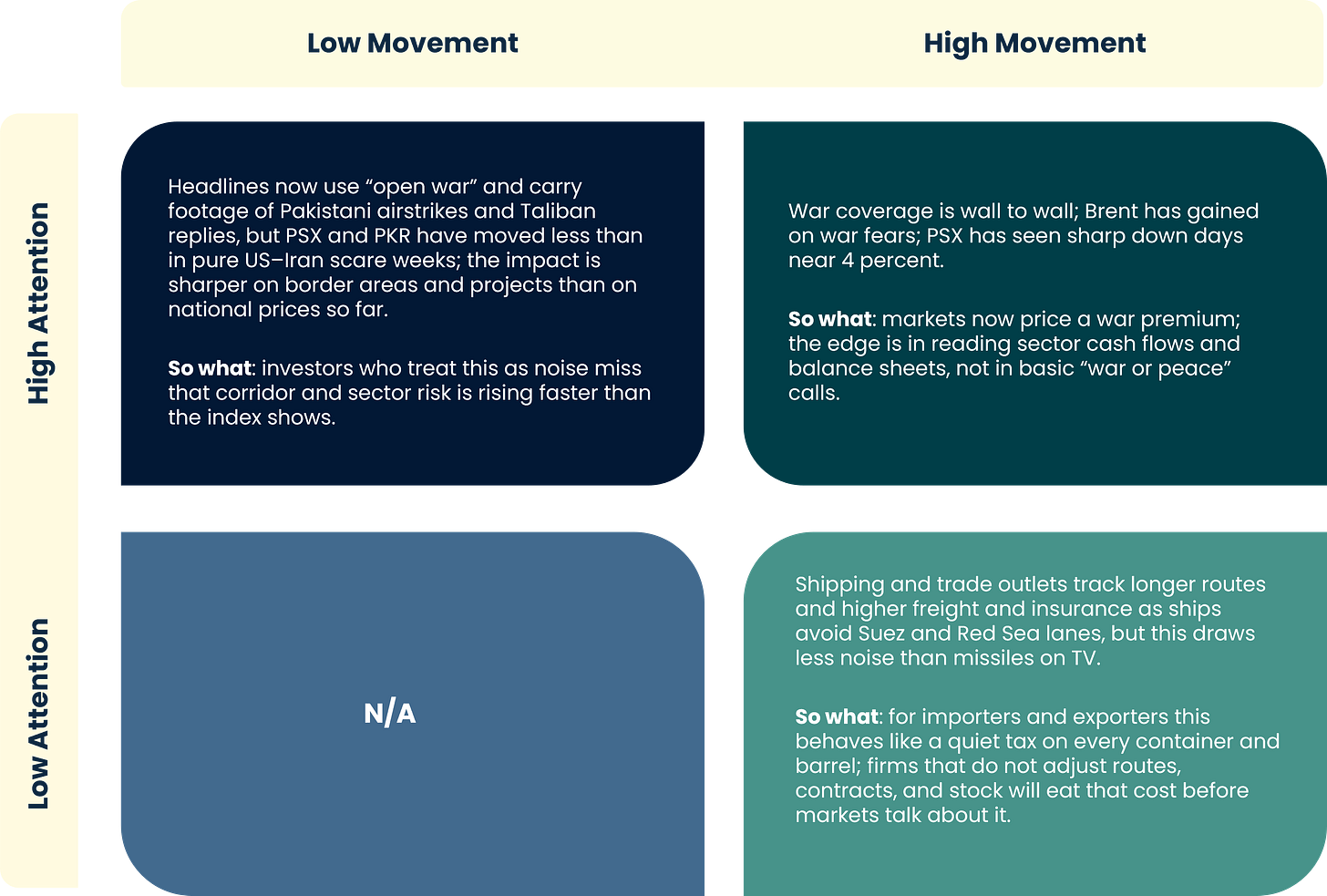 In this matrix, “attention” is media and commentary; “movement” is prices and real flows. Attention is high when an issue dominates major outlets, low when only a narrow crowd watches it. Movement is high when prices or real indicators shift by more than about 2 percent; low when they barely move.